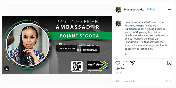 The role of being an ambassador representing the country is an honour and privilege for Segooa. "To represent Brand South Africa as a Play Your Part ambassador is something I never even dreamt of. I am still in awe." She adds: "Academia is an excellent career path which affords one with dynamic opportunities like this role as an ambassador. I am extremely grateful and will keep the Unisa flag flying high."