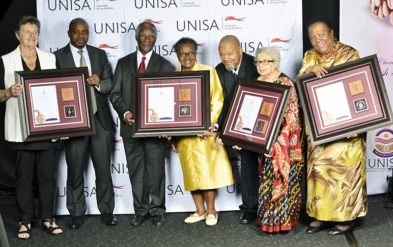 Gill Marcus (Outstanding Alumnus Award), Sakhi Simelane (Chairperson: Unisa Council), Thabo Mbeki (Unisa Chancellor), Sally Motlana (Unisa Robben Island Award), Prof. Mandla Makhanya (Principal and Vice-Chancellor, Unisa), Dr Frene Ginwala (Public Servant Award), and Naledi Pandor (Outstanding Educator Award)