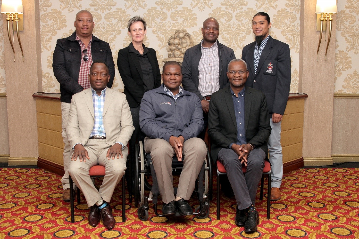 Front row (from left to right): Dr Phasoane Mokgobu: Vice-Principal: Institutional Advancement, Mr P Nkuna (ARCWiD) and Mr David Farirai: Director: Institutional Advancement Back row (from left to right): Mr Sipho Malefo: Centre for Graduate Studies: Masters and Doctoral Support, Ms Erin Naude: Gauteng Regional Office, Mr Frankie Mojapelo: Deputy Director: Institutional Advancement and Mr Moeneeb du Plessis: Alumni Relations
