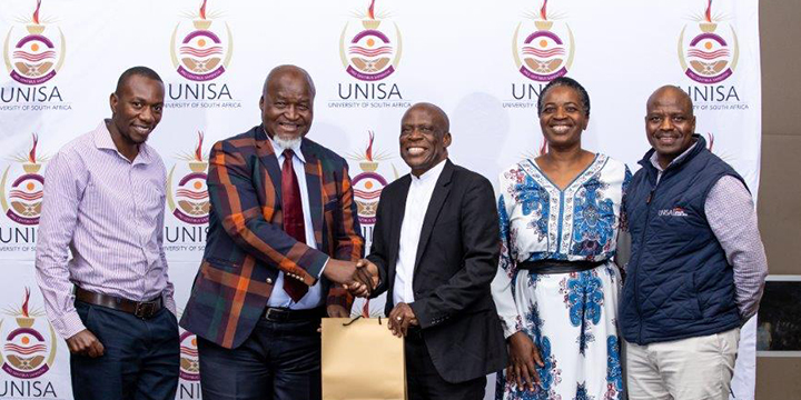 (From left) Njabulo Mhlongo, Convenor of the Mbombela Chapter, Dr Emmanuel Tshikwatamba, Campus Director of the University of Mpumalanga, Siyabuswa Campus, Dr Lesiba Molepo, Acting Regional Director, North Eastern Region, Khomotso Khoza, Regional Service Centre Manager, North Eastern Region, and Frankie Mojapelo, Acting Director: Institutional Advancement
