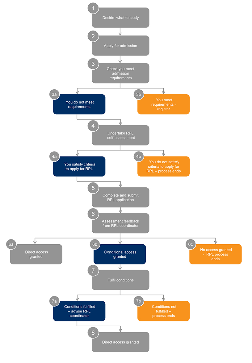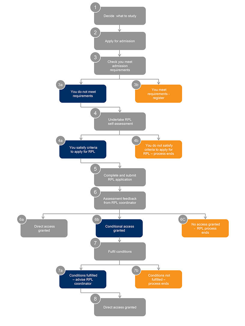 RPL is required. You may contact the RPL academic coordinator for more information. The RPL process allows for alternative access to a postgraduate qualifications. Applying for direct access to a postgraduate qualification means the following: