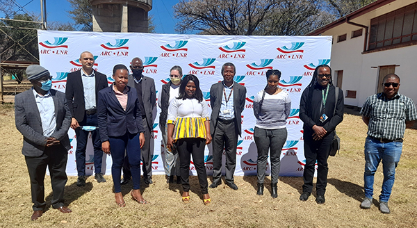 Back, from left: Prof Llewellyn Leonard, School Director: Ecological and Human Sustainability; Prof Sogolo Lebelo, CAES Director: School of Agriculture and Life Sciences; Dr Van der Westhuizen, ARC researcher; Prof Solomon Magano, CAES Executive Dean; Dr Tracey Masebe, Acting Chair: Department: Life and Consumer Sciences; Prof Monde Ntwasa, CAES Acting Deputy Executive Dean; and Manda Nevhutanda, Facilities Manager: ARC.