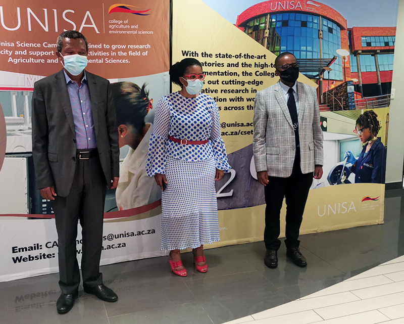 Prof Ramagoai Magano (Executive Dean: CAES), Prof Puleng LenkaBula (Principal and Vice Chancellor), and Prof Bhekie Mamba (Executive Dean: CSET)