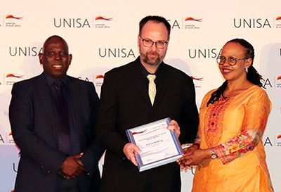 Ayanda Noma (Director: Innovation and Technology Transfer) and Prof Thenjiwe Meyiwa (Vice-Principal: Research, Postgraduate Studies, Innovation and Commercialisation) congratulate Prof Hennie Stoffberg (College of Agriculture and Environmental Sciences) (centre) on his First Patent Granted in South Africa Award: Irrigation Sprinkler.