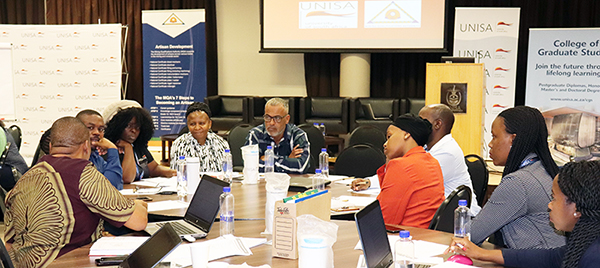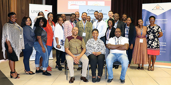Participants at the first stakeholder workshop with (seated) Xolisa Njikelana (Learning Programmes Operation Manager: MQA), Prof Lindiwe Zungu (Executive Dean: College of Graduate Studies and project leader) and Dr Joseph Komane (Research Specialist: MQA)