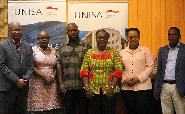 From left: Dr John Kole (Acting Deputy Executive Dean: College of Law), Prof Mfari Budeli (Acting Director: School of Law), Prof Amos Saurombe (Mercantile Department: College of Law), Prof Christine Ofulue (Director: Directorate of Research Administration and Advancement, National Open University of Nigeria), Prof Thenjiwe Meyiwa (Vice-Principal, Research, Postgraduate Studies, Innovation and Commercialisation) and Prof Tukishi Manamela (Acting Head: Graduate Studies and Research)