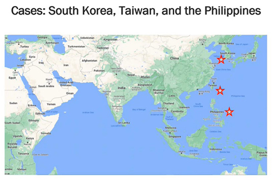 Regarding the initial conditions, the Philippines had a lower initial condition score than Taiwan and Korea. All the countries had a democratic wave in the 1980s. Prior to that, there was the authoritarian rule.