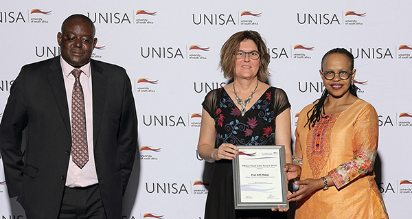 Harry Bopape (Director: Research Support) and Prof Thenjiwe Meyiwa (Vice-Principal: Research, Postgraduate Studies, Innovation and Commercialisation) congratulate Prof Katherine Malan (CEMS) (centre) on her membership of the 2019 Unisa Million Rand Club.