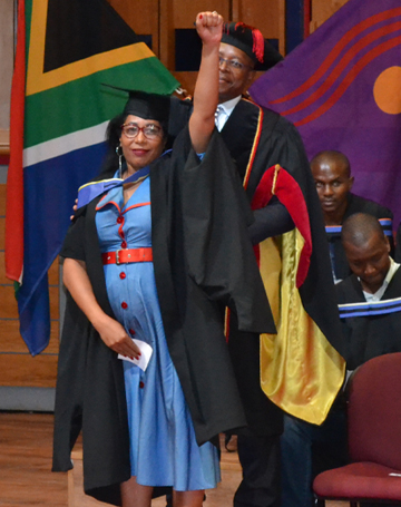 Unable to attend the graduation ceremony, EFF leader Julius Malema, who himself holds an BA Honours degree in Philosophy from Unisa, conveyed his congratulations via Twitter. ‘I'm very proud of you and congratulations once again my sister,’ he tweeted. ‘We remain inspired.’