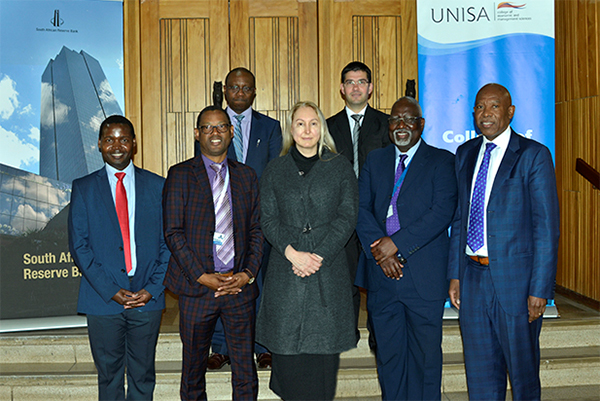 Front, from left: Prof Christopher Mulaudzi (Acting Deputy Executive Dean: CEMS), Prof Khehla Ndlovu (Vice-Principal: Strategy, Risk and Advisory Services, Unisa), Annabel Bishop (Chief Economist at Investec Bank), Prof Thomas Mogale (Executive Dean: CEMS), Lesetja Kganyago (Governor of the SARB); back from left: Dr Montfort Mlachila (Senior Resident Representative of the International Monetary Fund in South Africa) and Fanie Joubert (Senior Lecturer in Economics at Unisa).