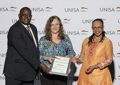 Harry Bopape (Director: Research Support) and Prof Thenjiwe Meyiwa (Vice-Principal: Research, Postgraduate Studies, Innovation and Commercialisation) congratulate Prof Kerstin Jordaan (CEMS) (centre) on her membership of the 2019 Half Million Rand Club.