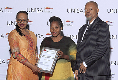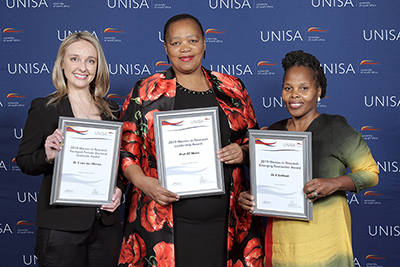 2019 Women in Research Awards: Dr Sintechè van der Merwe (College of Human Sciences) (Youngest Female Doctoral Graduate), Prof Zethu Nkosi (College of Human Sciences) (Leadership) and Dr Itumeleng Setlhodi (College of Education) (Emerging Researcher)