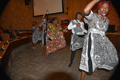 Sangoma Gogo Dineo Ndlazi (centre) opened the 2018 Decoloniality Conference. |