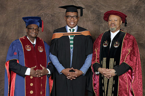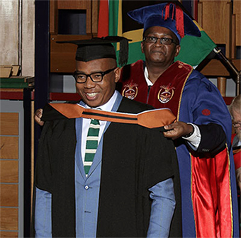 A proud moment for Mduduzi Manana (Deputy Minister: Higher Education and Training) as he is capped by Prof Michael Temane (Acting Registrar).