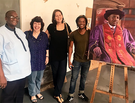 Some of the members of the official portrait commissioning committee: Prof Michael Temane (Acting Registrar), Ammi Ryke (Archivist), and Dr Gwen Miller (Visual Arts specialist), with the artist, Nhlanhla Nhlapo, in his studio
