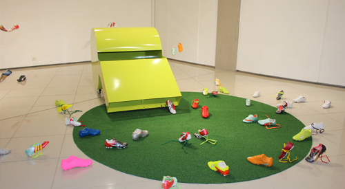 Swart’s Down the Rabbit Hole consisted of a still motion animation video which was refracted through icosahedron acrylic shape to blur the disorientation inspired by Alice in the Wonderland. The multiphrenic self is refracted to experience the sense of fractured identities, living within the life-world of postmodern schizophrenia.