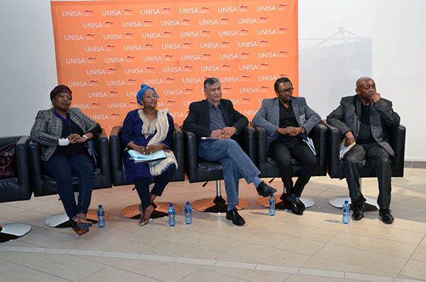 Sibongile Mkhabela (CEO, Nelson Mandela Children’s Funds), Dr Nthabiseng Motsemme (Academic Director, NIHSS), Ismail Mahomed (CEO: Market Theatre and former CEO: Standard Bank-Grahamstown Arts Festival), Aubrey Sekhabi (Artistic Director: South African State Theatre), and Dr Mbongeni Ngema (composer and producer of Sarafina)