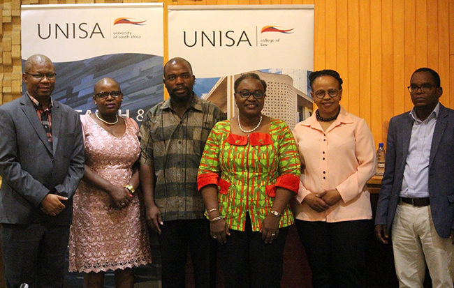 From left, Dr John Kole (Acting Deputy Executive Dean: College of Law), Prof. Mfari Budeli (Acting Director: School of Law), Prof. Amos Saurombe (Mercantile Department: College of Law), Prof. Christine Ofulue (Director: Directorate of Research Administration and Advancement, National Open University of Nigeria), Prof. Thenjiwe Meyiwa (Vice-Principal, Research, Postgraduate Studies, Innovation and Commercialisation) and Prof. Tukishi Manamela (Acting Head: Graduate Studies and Research)