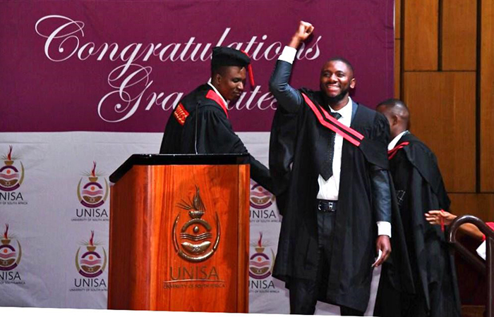 Unisan Maanda Hlengane has graduated with a Diploma in Law at Unisa. His announcement on stage was followed by resounding cheers from fellow graduates, family and co-workers. A staff member at the Unisa Department of Tuition Support and Facilitation of Learning, Hlengane is the former Chairperson of the Unisa Economic Freedom Fighters Student Command (EFFSC) and is currently the Speaker of the Tshwane Regional Student Parliament.