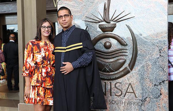 Nettin Daya, accompanied by wife Avisha: National Diploma, Information Technology: Studying with Unisa is excellent; the syllabus was quite challenging, but I managed to break through. For Unisa’s 150th anniversary, I would like the institution to make visible more of its courses to reach out to people with different skills-sets.