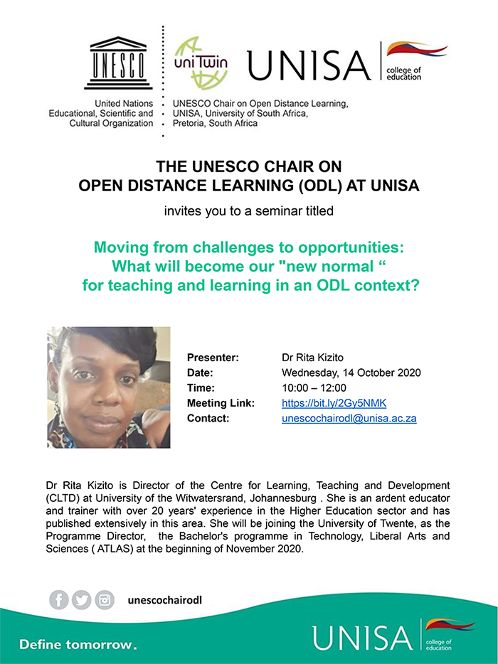 On the morning of 14 October 2020, the UNESCO Chair of Open Distance Learning at Unisa held its eighth virtual research seminar, featuring Dr Rita Kizito, Director: Centre for Learning, Teaching and Development (CLTD) at the University of the Witwatersrand (Wits).