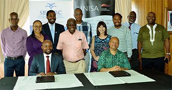 Seated from left: Dr Thula Sizwe Dlamini (Executive Director: ESEPARC) and Prof Mandla Makhanya (Principal & Vice-Chancellor, Unisa) with members of their teams