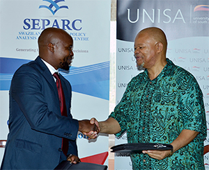 Unisa and the eSwatini Policy Analysis and Research Centre (ESEPARC) entered into a memorandum of understanding (MoU) to jointly host public lecture series, seminars, workshops and training. ESEPARC will also, when necessary, contract Unisa to provide training for participants at the centre and conduct research on its behalf.