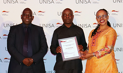 Ayanda Noma (Director: Innovation and Technology Transfer) and Prof Thenjiwe Meyiwa (Vice-Principal: Research, Postgraduate Studies, Innovation and Commercialisation) congratulate Prof Titus Msagati (NanoWS) (centre) on his First Patent Granted in South Africa Award: Recovery of Crude Oil.