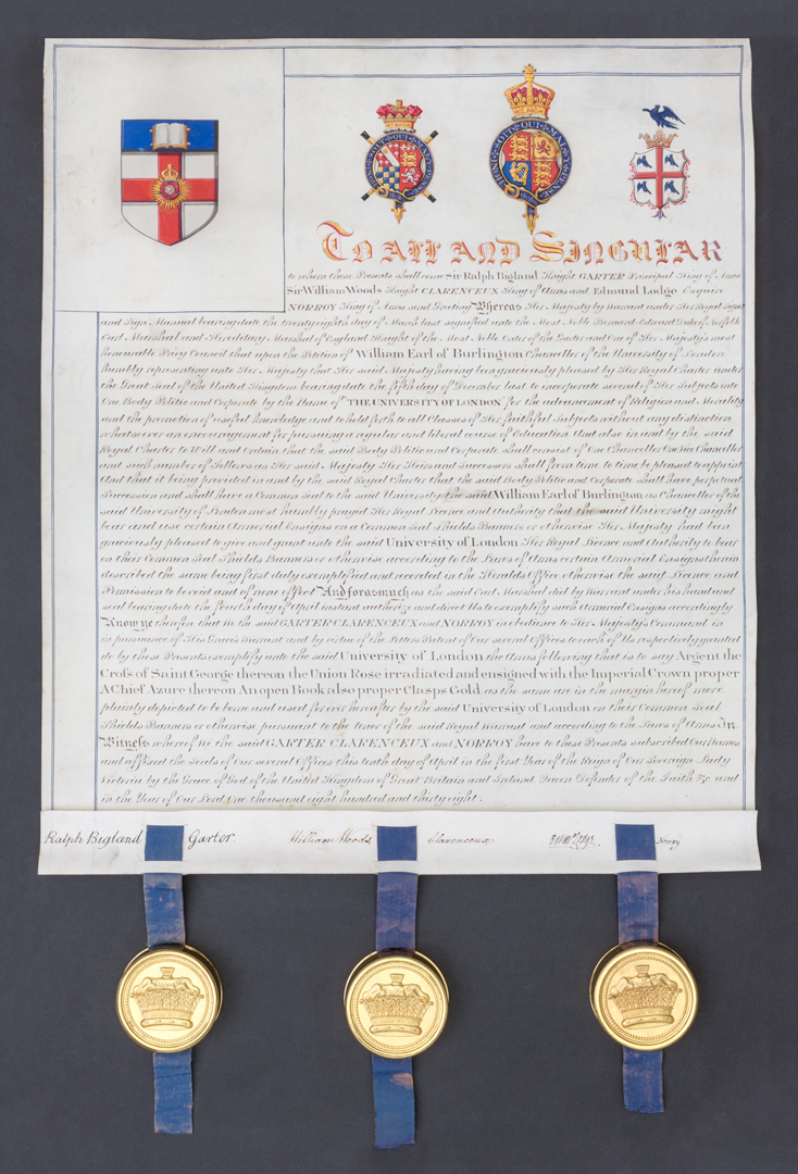 Description: A royal charter grants a right or power – in the case of this 1877 charter, the recognition of degrees – to an institution.