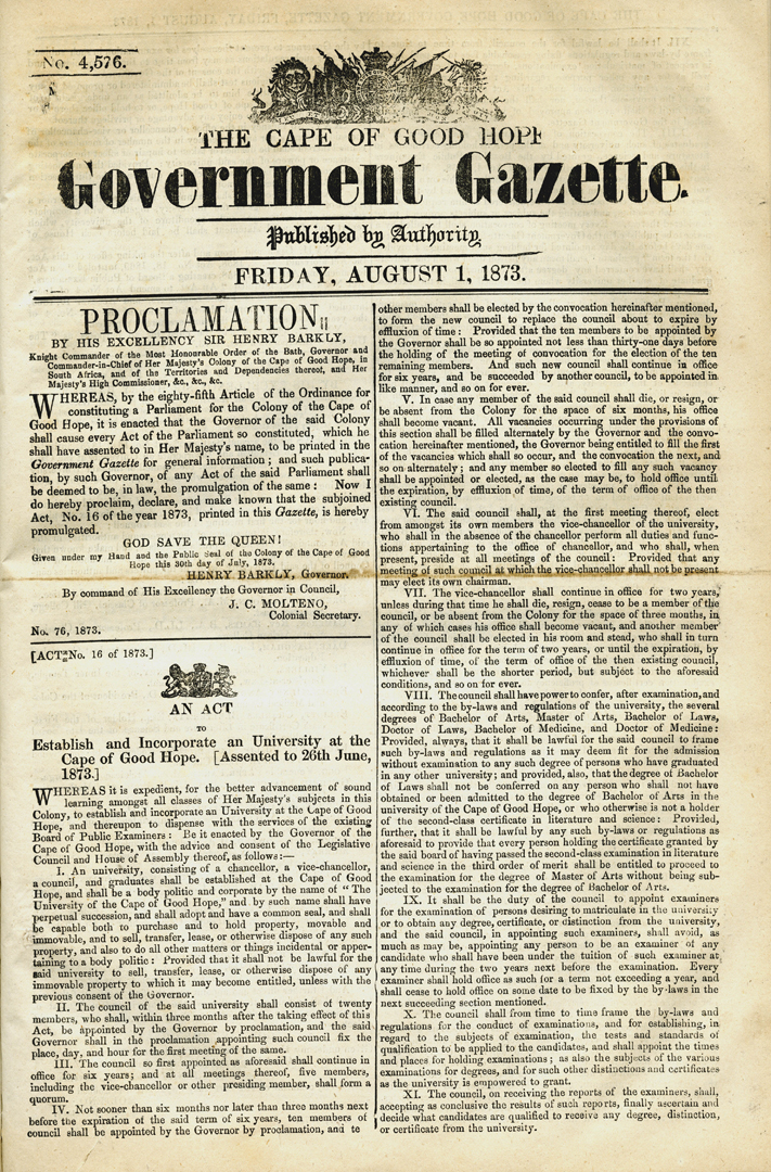 Description: The proclamation establishing the University of the Cape of Good Hope, 1873.