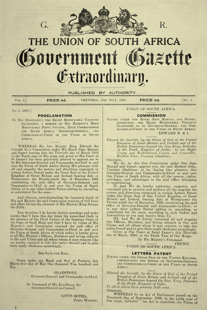 Description: The first Government Gazette of the newly established Union of South Africa, 1910.