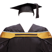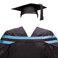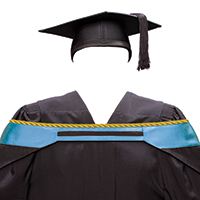 Hons BAdmin/ BAdmin Hons Black, edged with 60mm smalt (blue) ribbon bordered with a yellow and white cord |