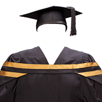 Hons BCom (SET)/ BComHons (SET) Black, edged with 60mm smalt (blue) ribbon bordered with a white cord |