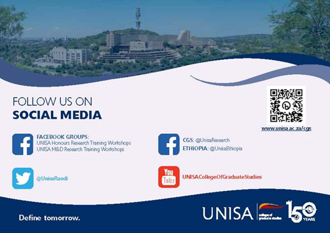 Unisa's School of Interdisciplinary Research and Graduate Studies (SIRGS) is a central hub where honours, postgraduate diplomas, master's and doctoral students are nurtured and supported. The SIRGS offers a range of workshops that deal with all aspects of research to equip and skill postgraduates to excel in research and innovation and complete their degrees successfully. Training workshops range from general to more specialised areas and are designed to fit the requirements of specific research disciplines.