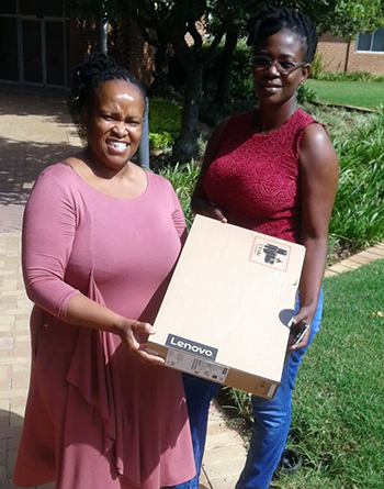 Smiles all round as a student receives her Unisa laptop from Mavis Sibanda (left), Deputy Director in the Office of the Registrar