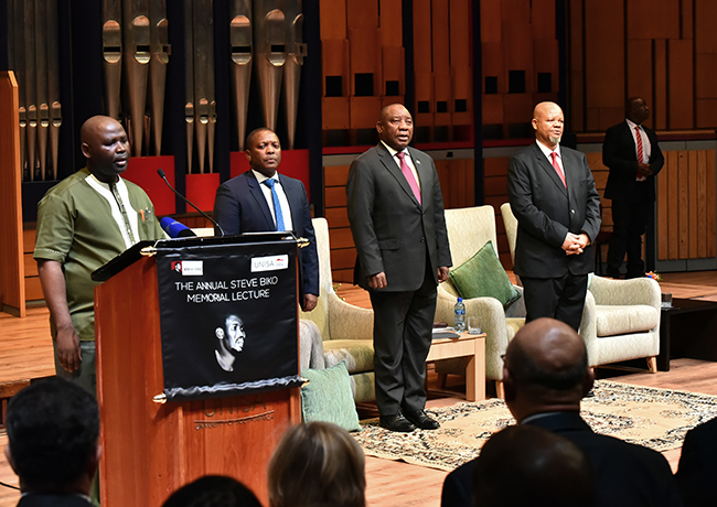President Ramaphosa said that it was an honour to deliver this lecture at Unisa, his alma mater. Placing Steve Biko in context, he said that it is good to have this lecture during a year that saw the celebration of the centenaries of Nelson Mandela and Mama Sisulu. ‘Madiba had huge respect for Steve Biko and loved him,’ said the President. ‘Earlier this week, we commemorated the 41st anniversary of the death in detention of Steven Bantu Biko. In the week that we commemorate a cruel death, we also honour and celebrate a remarkable life. It was a life dedicated to the pursuit of freedom, equality and truth. It was the life of a great, but humble revolutionary who fiercely rejected the false hierarchy of races. He spoke with a burning eloquence of the essential humanity of all people. He understood that the system of apartheid was predicated on the deliberate lie of white supremacy and black inferiority. The philosophy of Steve Biko was fundamentally the antithesis of this lie; it was about establishing the principles on which a new and more humane society would be established.’
