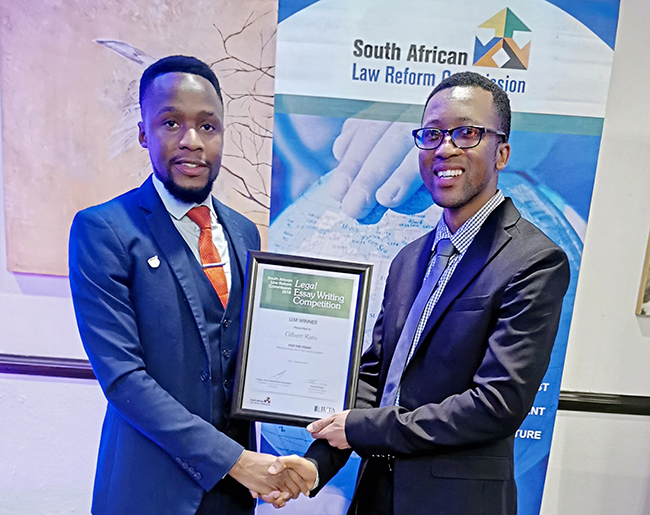 During the awards ceremony, Gilbert Phindile Kato, LLM student at Unisa and a candidate attorney at Webber Wentzel Attorneys was announced the winner of the LLM category. Kato’s legal essay titled “Moving away from binary system”, received the highest score from the panel of judges composed of independent professors and doctors of law from various South African Universities. Kato wrote the legal essay under the supervision of Nzumbululo Silas Siphuma, who is a senior lecturer in the Department of Jurisprudence at Unisa’s College of Law (CLAW).